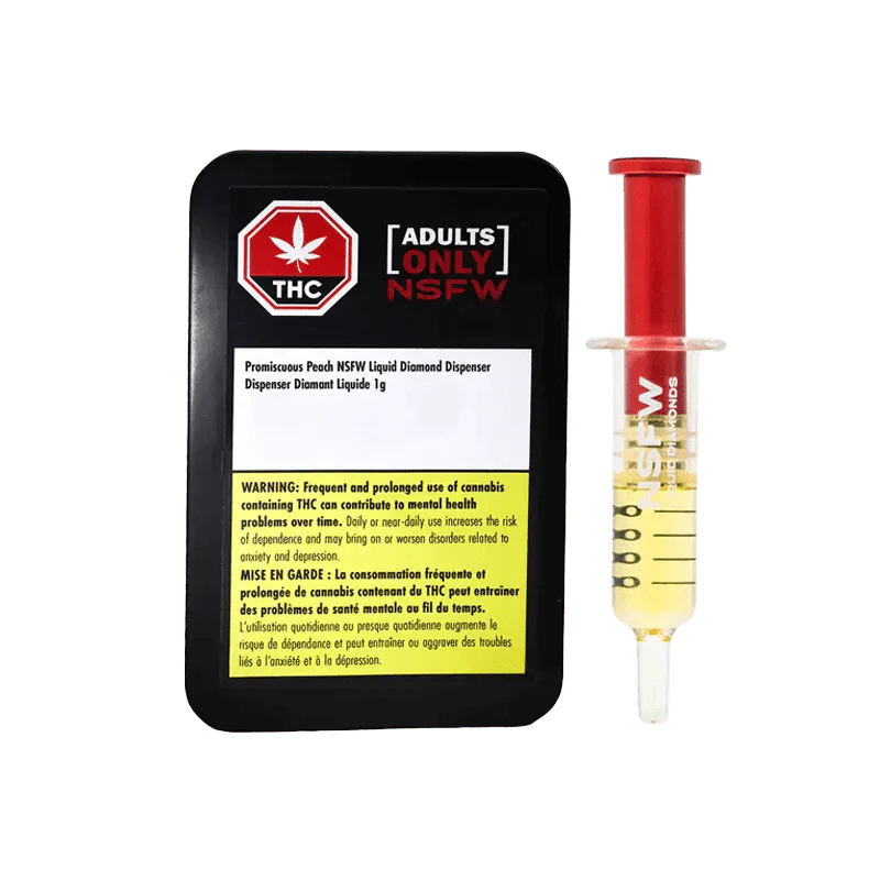 Adults Only Promiscuous Peach NSFW Liquid Diamond Dispenser. This all-glass dispenser multi-tool is packed with insanely potent liquified THC diamonds that present a burst of juicy peachy flavour. All Adults Only NSFW Liquid Diamond dispensers are made using our advanced BHO extraction equipment and processes. You won’t find any added solvents, pigments, fillers or waxes in this premium extract.